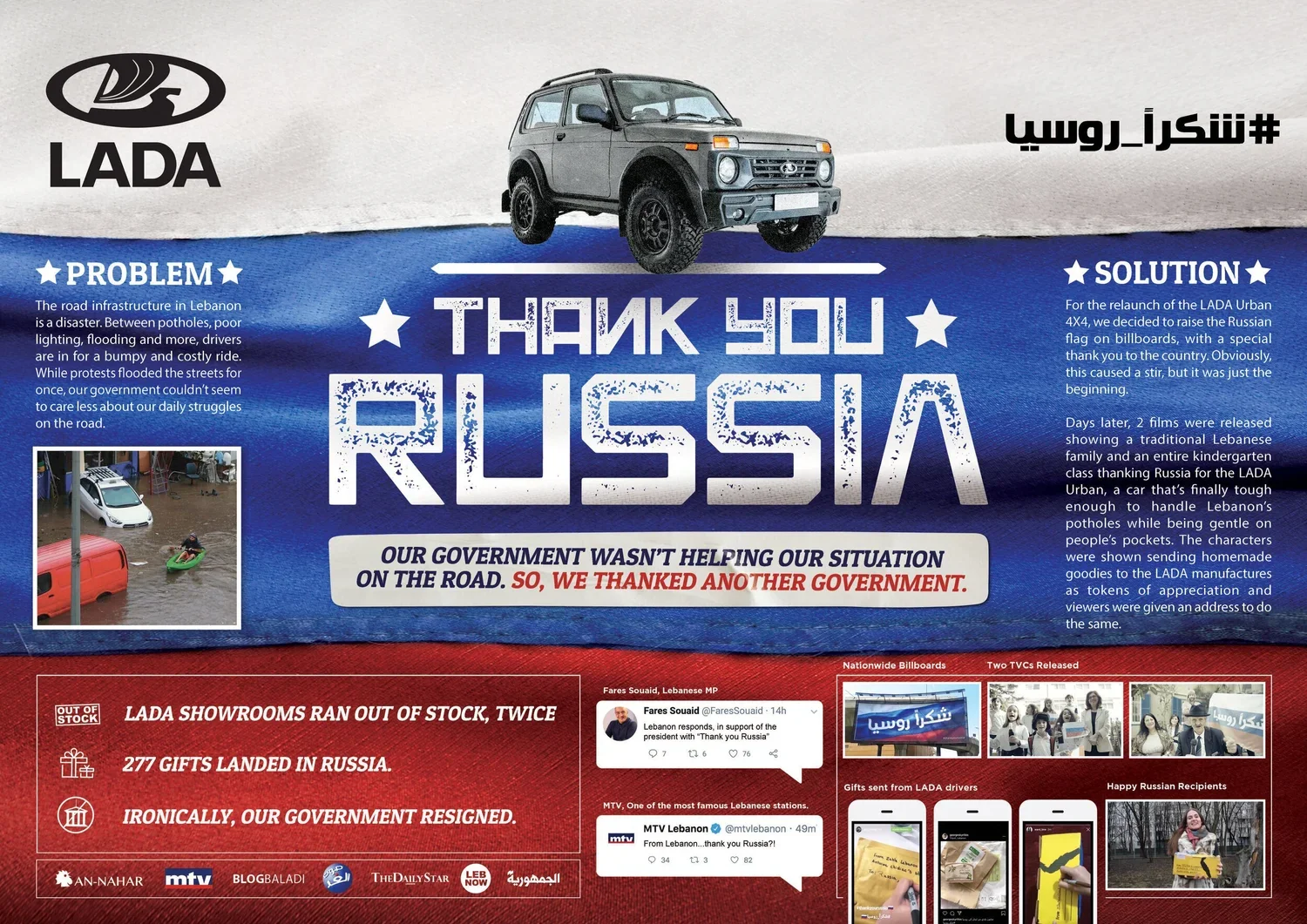 In Lebanon, years of neglected infrastructure turned every drive into a daily struggle, while public protests failed to move a government that refused to listen. So for the relaunch of the LADA Urban 4x4, we redirected the frustration with a provocative twist. Instead of demanding solutions from our own government, we publicly thanked another one. By raising the Russian flag on billboards and launching films of Lebanese families and children expressing gratitude to Russia for a car tough enough to survive Lebanon’s roads, LADA turned political anger into cultural conversation. What began as satire became action, flooding Russia with gifts, emptying showrooms, and proving that when leadership fails, brands can speak where governments won’t.