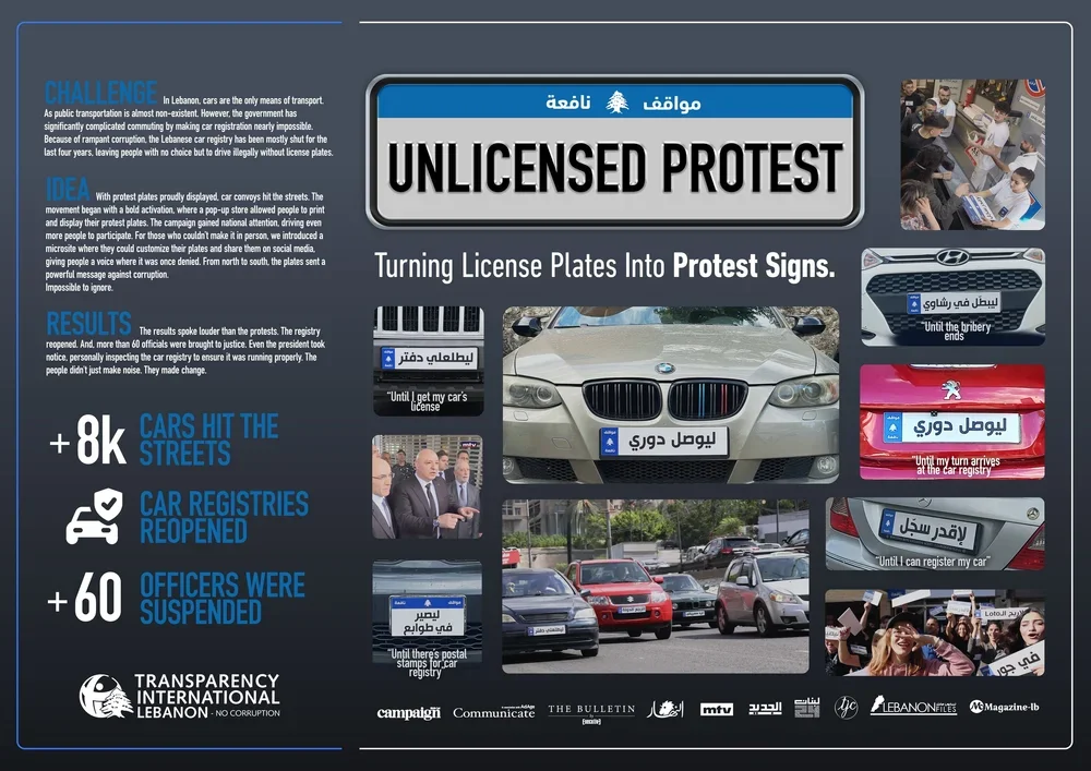 In a country where cars are essential but corruption made legal registration nearly impossible, thousands of Lebanese were forced to drive illegally without license plates. Instead of hiding the problem, we turned it into a protest. With Transparency International Lebanon, we transformed license plates into bold protest signs, allowing drivers to publicly display messages against corruption as convoys filled the streets nationwide. From physical pop-up activations to a digital platform that let anyone join in, the absence of license plates became impossible to ignore. By turning everyday cars into moving protests, the people didn’t just make noise, they forced the system to move.